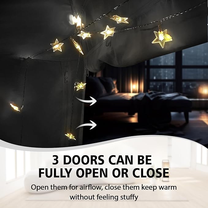 - Breathable Unstuffy: The 3 double-sided zippered doors of the bed tent can be fully opened for ventilation. when you closed 3 doors, the mesh on both sides promotes air circulation, keeping you warm without feeling stuffy.