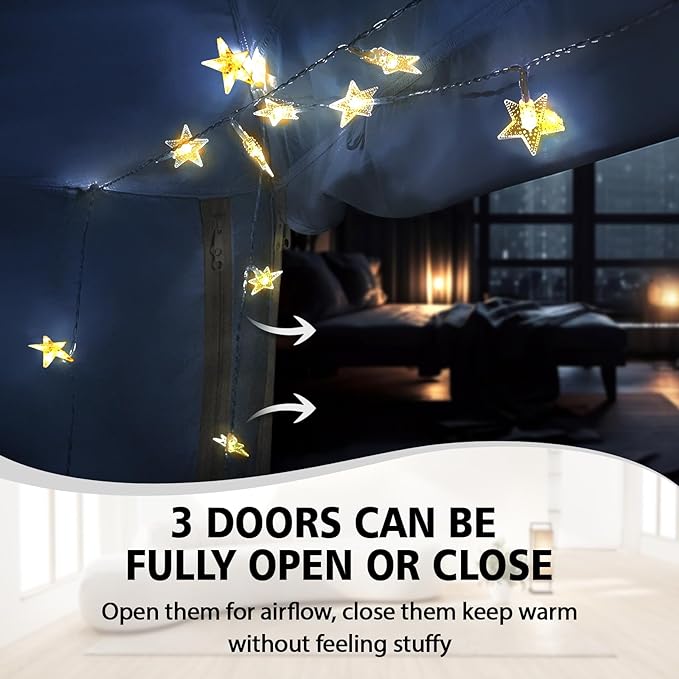 - Tent Light: The bed tent include a string star lights, transforming the bed tent into a music room, indoor castle, or camping-themed bedroom, adds a touch of magic to your sleep tent, providing them with a fun and private space of their own.