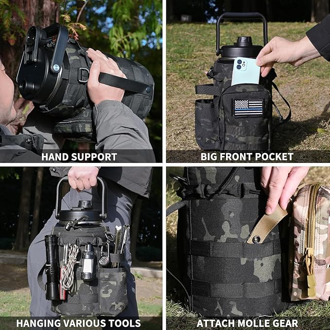 - 【Tactical Bag For Easy Carring】:Our water bottle holder is made of double-layer polyester and insulating Oxford cloth, which provides protection for the water jug. The water bottle bag also adds warmth, making it more effective in maintaining cold or hot. It has a detachable shoulder strap for carrying and a hand support strap on the side for easy pouring of water. Water bottle carrier bag has MOLLE webbing attachments and a large storage compartments for your phone, keys, wallet and more.