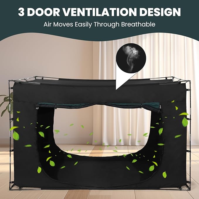 - 【Easy Access - 3 Doors】This bed tent has 3 spacious large doors with double zippers that can be opened or closed inside and outside, making it easy for you to get in and out, and the 3 doors both have mesh screens to prevent mosquitoes from entering, turn on the fan to bring you a gentle sleeping wind through the mesh screens