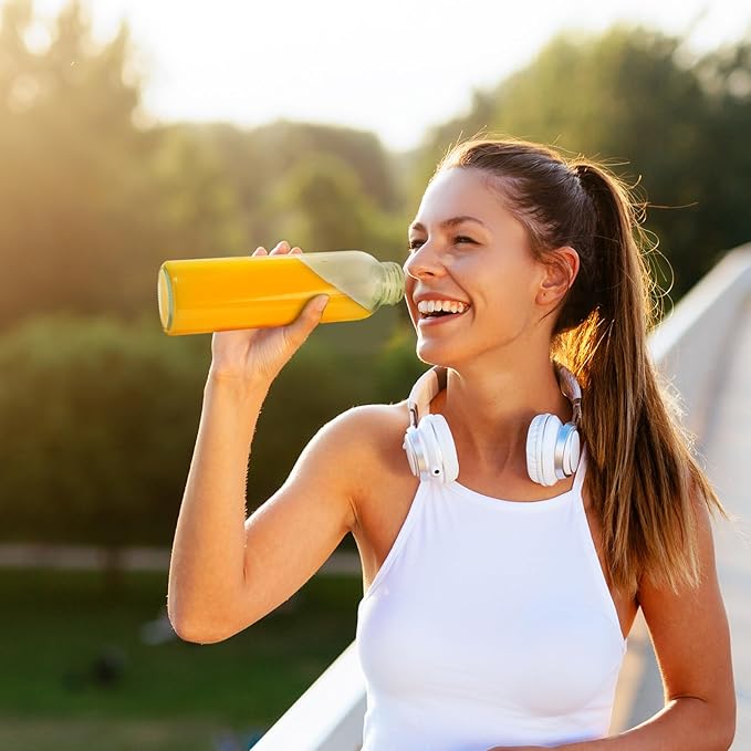 - GLASS BOTTLES FOR JUICING AND MORE: Durable stainless steel lid with air and water-tight seals, it’s completely airtight to keep your beverage fresh without any worry of spills. Throw this glass water bottle in your bag or car and get a healthy start to your day with a juice, smoothie, brew, ice tea, iced coffee, milkshakes, Kombucha. The 100% leak proof glass bottle will never leave a leaky mess no matter how you place it. The clear glass helps you quickly spot the drink you're in the mood for.