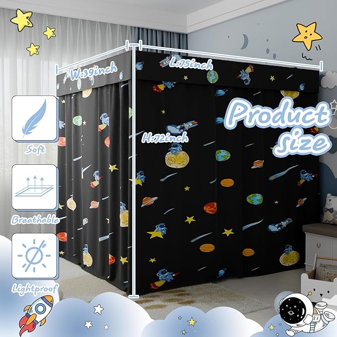 - 【Lightproof Bed Curtains】As a perfect decoration for kid's room,our black planets canopy bed curtains has a strong blackout effect. Even during the day,allows your little girl or boy have a restful and comfortable sleeping environment.