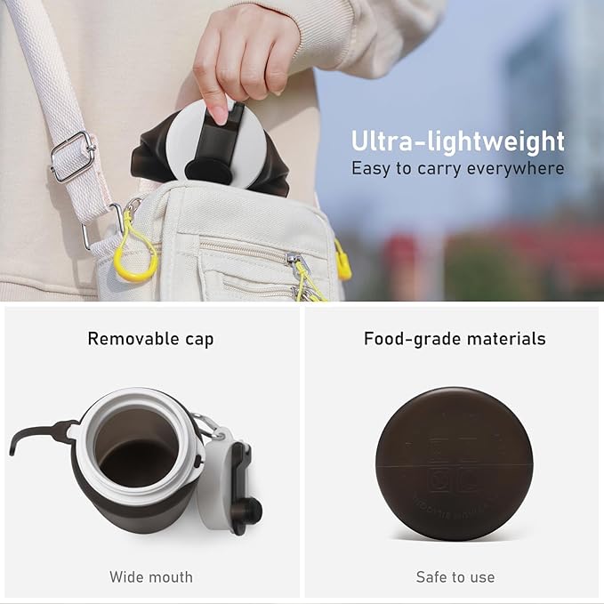 - THOUGHTFUL DESIGN: The cap can be securely fixed at the end, preventing it from touching your forehead while drinking. Once the cap is rotated and removed, the wide mouth easily accommodates ice cubes or fruits and makes cleaning a breeze.
