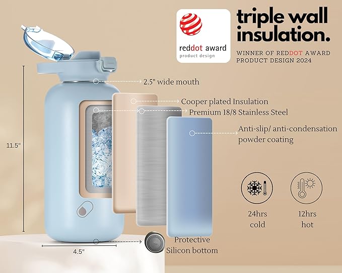 - Triple-wall Insulation for Temperature Control: Keep your drinks hot and cold for longer with our half gallon insulated water bottle. The triple vacuum insulated design ensures your beverages stay hot or cold for hours, ideal for staying refreshed during workouts, hikes, or daily activities.