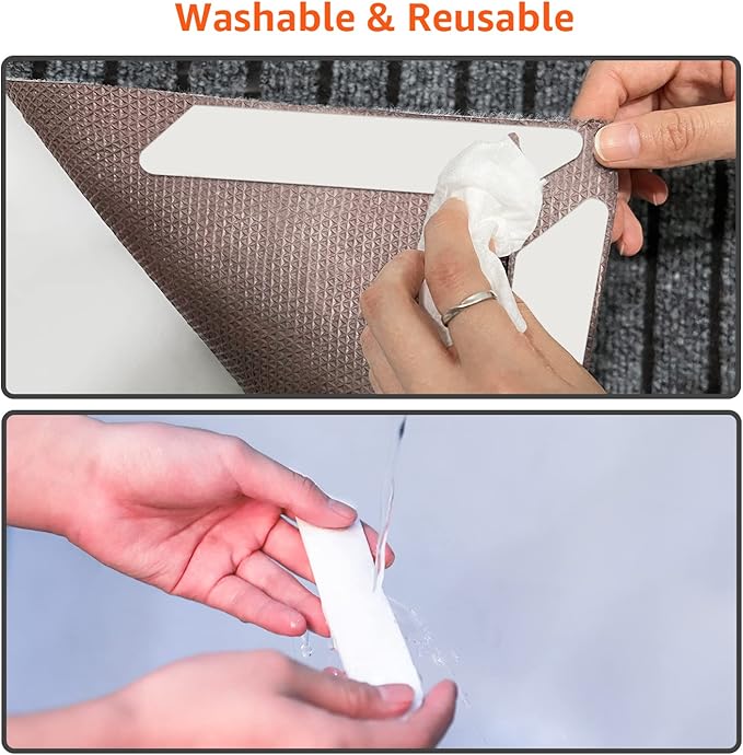 - đăWASHABLE AND REUSABLEăStill bothered by those cheap disposable non-slip tapes? You can wipe out this anti-slip carpet tape dirt from âon floorâ side with wet tissue or washing with carpet together then airing it to refresh stickiness. The ZONGOOL non-slip carpet tape can serve you again & again.