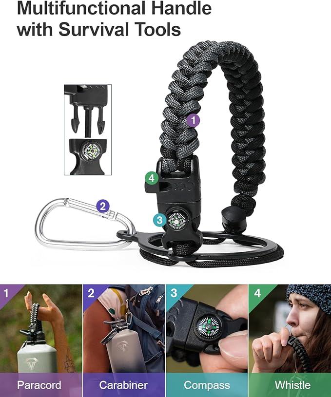 - Ready for adventures: The paracord handle is crafted from sturdy braided rope with an attached survival kit. This includes a compass, a whistle, and a clip, making it an ideal companion for any outdoor activity — be it camping,hiking or exploring new places through travelling.