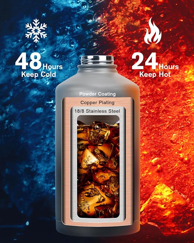 - Cold for 48H & Hot for 24H:Topre 128 oz One Gallon Insulated Water Bottle features advanced double-wall vacuum insulation with copper plating, the water flask preserve the freshness and temperature of your drinks throughout the day.