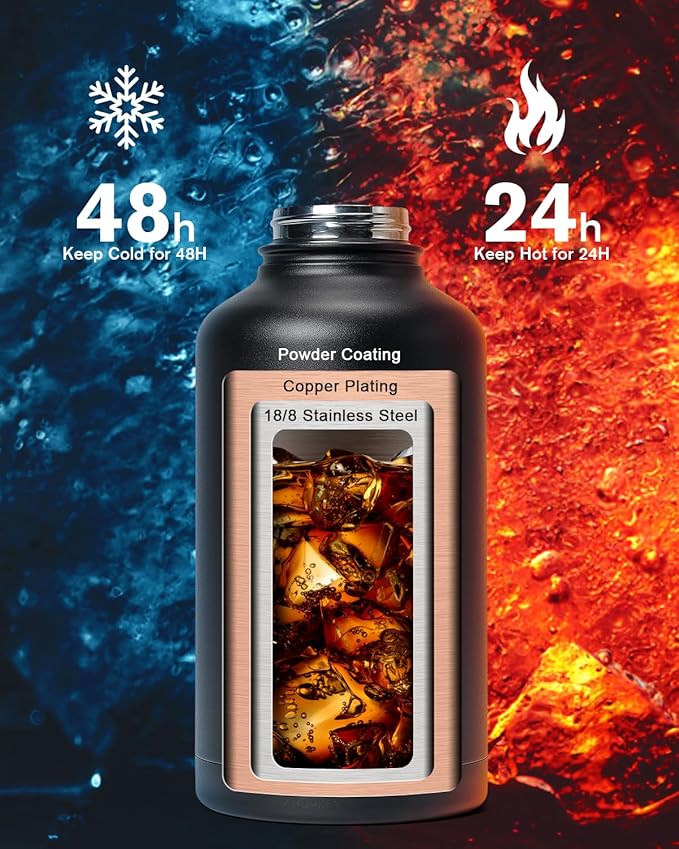- Cold for 48H & Hot for 24H:Topre 64 oz Half Gallon Insulated Water Bottle features advanced double-wall vacuum insulation with copper plating, the water flask preserve the freshness and temperature of your drinks throughout the day.