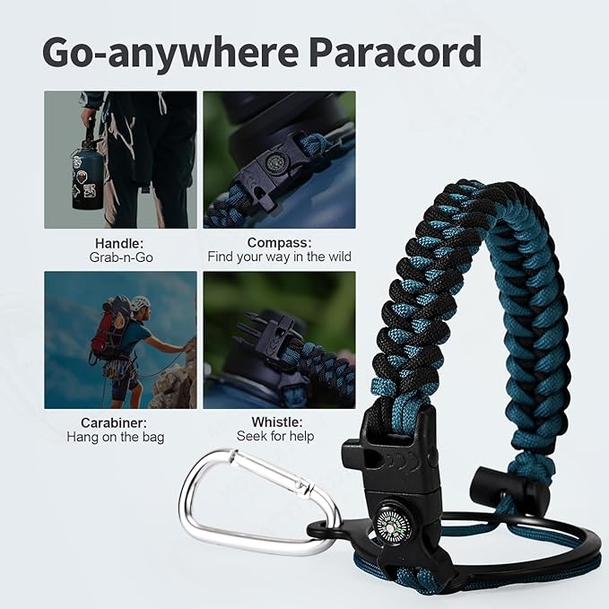 - Palm Fitting Paracord Handle: Compared to handle lids, nylon paracord on the bottle gives you more choices in terms of color coordination and coziness on your hands. Match the handle with your bottle to make a complete outdoorsy look. Compass and carabiner can be lifesavers for hiking and other expeditions