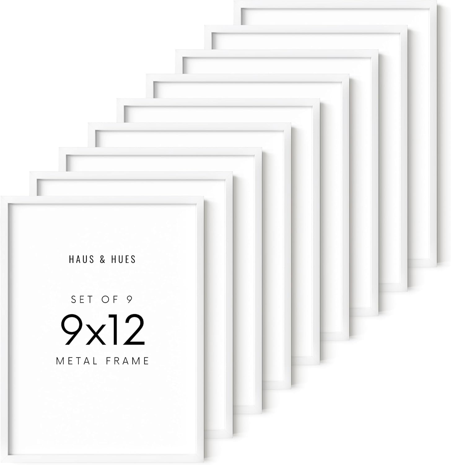 HAUS AND HUES 9x12 White Metal Picture Frames - Features Premium Aluminum, Vertical & Horizontal Hang, Shatterproof Plexiglass - Ideal for Home, Room, Office (9x12 in, White, Set of 9)