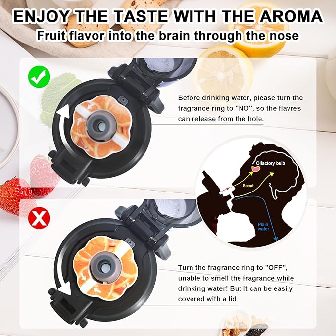 - 【How It Works】Scent water bottle with fruit lidsules Unlike ordinary water bottles, our innovative design delivers natural fruit essences directly to your brain through your nose, so you can experience the delightful aroma of fruits while hydrating. With 0 sugar and 0 calories, it's the perfect choice for a healthier lifestyle for you and your families