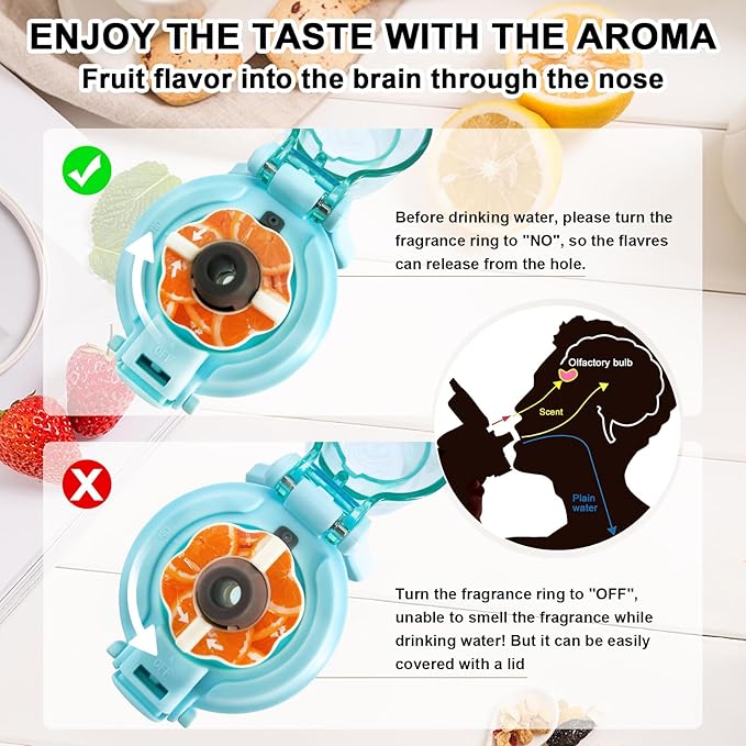 - 【How It Works】Scent water bottle with fruit lidsules Unlike ordinary water bottles, our innovative design delivers natural fruit essences directly to your brain through your nose, so you can experience the delightful aroma of fruits while hydrating. With 0 sugar and 0 calories, it's the perfect choice for a healthier lifestyle for you and your families