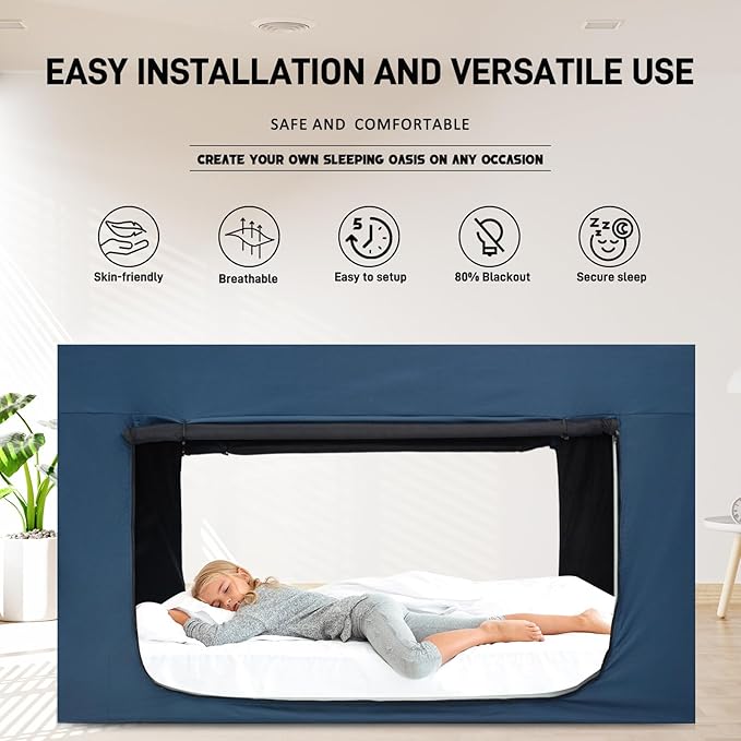 - ☑Easy Acess-4 Doors: This bed tent has 4 spacious large doors with double zippers that can be opened or closed inside and outside, making it easy for you to get in and out and don't worry about the orientation when setting up the tent. Each door has two layers of panels: the first layer is breathable mesh to ensure good ventilation; the second layer is black sponge fabric that reduces the light by 80%, you can choose the right light according to your needs, create your own sleeping oasis.