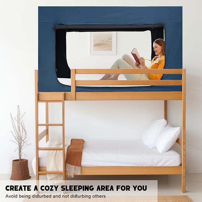 - ☑Cozy Sleeping Space: This bunk twin bed tent measures 80 x 60 x 47 inches, made of breathable and soft polyester fabric. The dark black fabric can reduce most of the light and is great for bedrooms, dorm rooms, or those who have trouble sleeping in bright environments, creating a cozy space to sleep in.