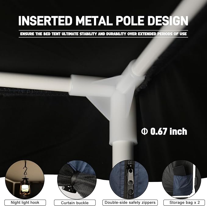 - ☑Reinforced Rectangular Design: Our bed tents feature a unique inserted pole design, compared to pop-up tents on the market, we use 0.67inch diameter metal poles to build the rectangular frame of the bed tents, which help this bunk twin bed tent ensure ultimate stability and durability over extended periods of use.