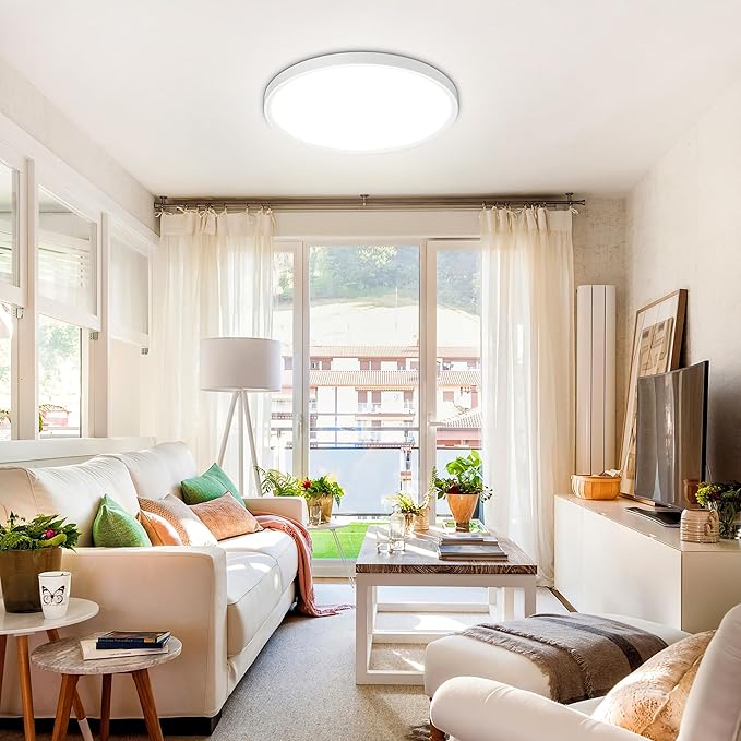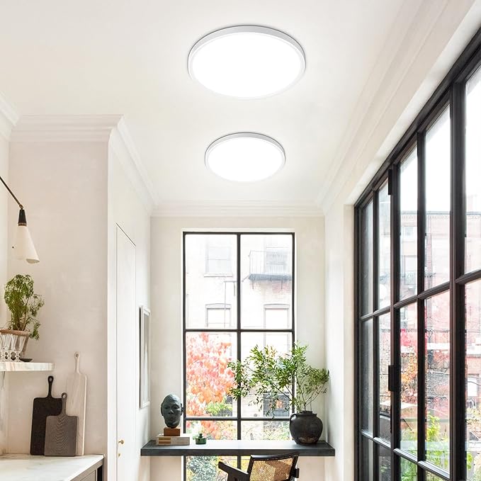 - 16-inch Dimmable Daylight White & Ultra-Thin Design: 32W LED flush mount ceiling light with 5000K daylight white color temperature, is dimmable so you can control the brightness to suit your different needs. 16 inches diameter LED ceiling lights are only 0.98 inches in thickness and are ideal for hallways, bathrooms, kitchens, closets, stairwells, bedrooms, living rooms, corridors, entrances, porches, mud rooms, children's rooms, dining rooms, bars, cafes, offices, hotels, and restaurants.