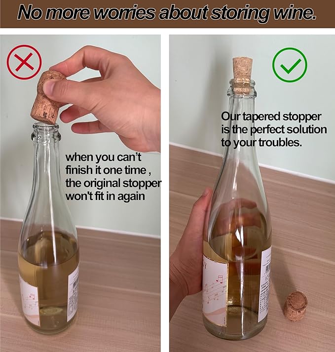 - Our conical replacement corks are made of natural soft wood material, good flexibility,free of harmful substances, safe and reliable, healthy and environmentally friendly, sturdy and durable,create a tight seal to ensure contents stay securely inside the bottle.