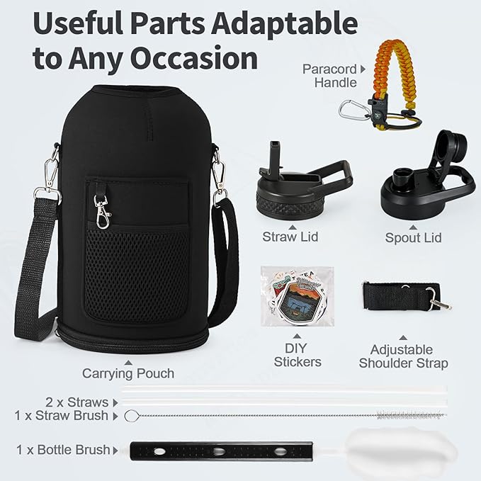 - After Services and Package: We offer continuous after-sales service against leakage and poor cold/hot-keeping capability, we are committed to 100% customer satisfaction. Your purchase includes: WixByti 128oz Water Bottle, Carrying Pouch with Adjustable Strap, Straw Lid with 2 Straws & 1 Straw Brush, Spout Lid, Paracord Handle, Water Bottle Stickers