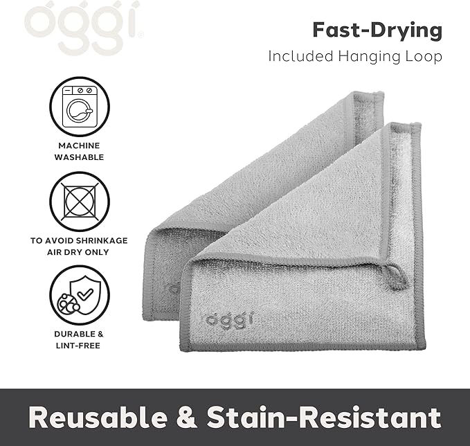 - HYGIENIC AND ODOR-FREE: Keep your kitchen fresh and sanitary with Oggi's naturally odor-free wine polishing cloth. No more musty smells as these wine glass drying cloths maintain their freshness after every wash, are highly stain-resistant and dry quickly with hanging loop, ensuring a clean, odor-free environment for your home wine glass and cocktail glass cleaning tasks.