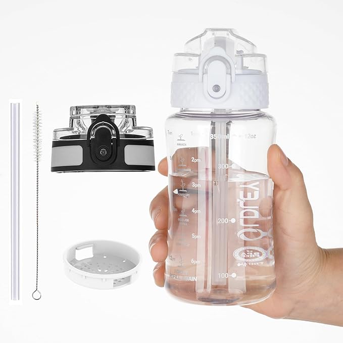 OLDLEY Kids Water Bottle for School, 12 oz (2 lids) BPA-Free Reusable Leak-proof Durable Tritan Plastic Water Bottles with Straw & Chug Lids, Anti-dust Spout Cover (Clear)