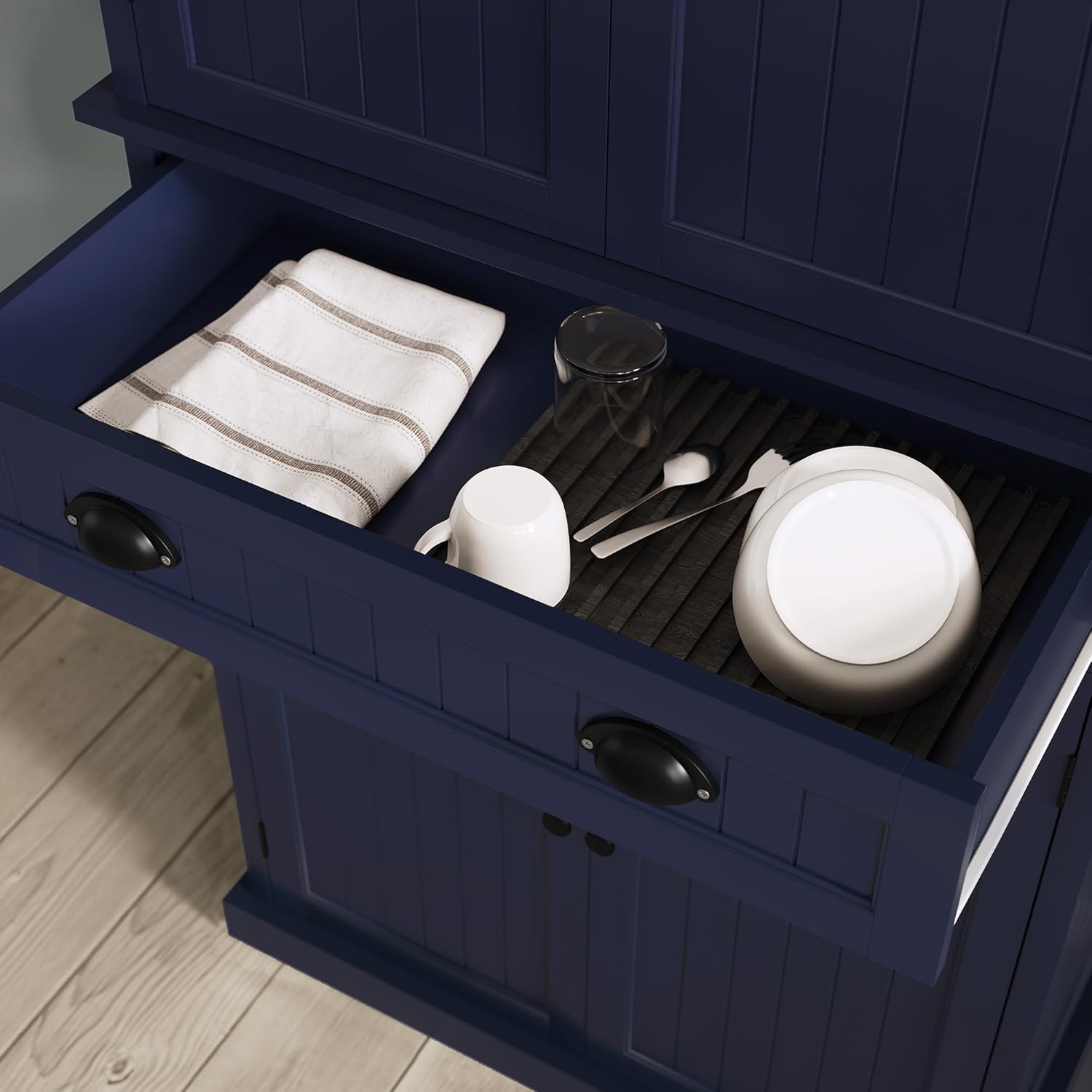 - 【Gorgeous Pantry】This white elegant kitchen pantry cabinet is a stylish and handsome piece of furniture, it has vertical smooth line on the panels, and pure blue modern colors overall the entire product, so that makes this white kitchen pantry cabinet will fit well with your existing home decor