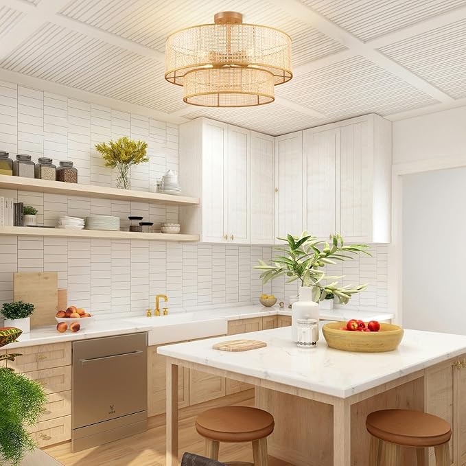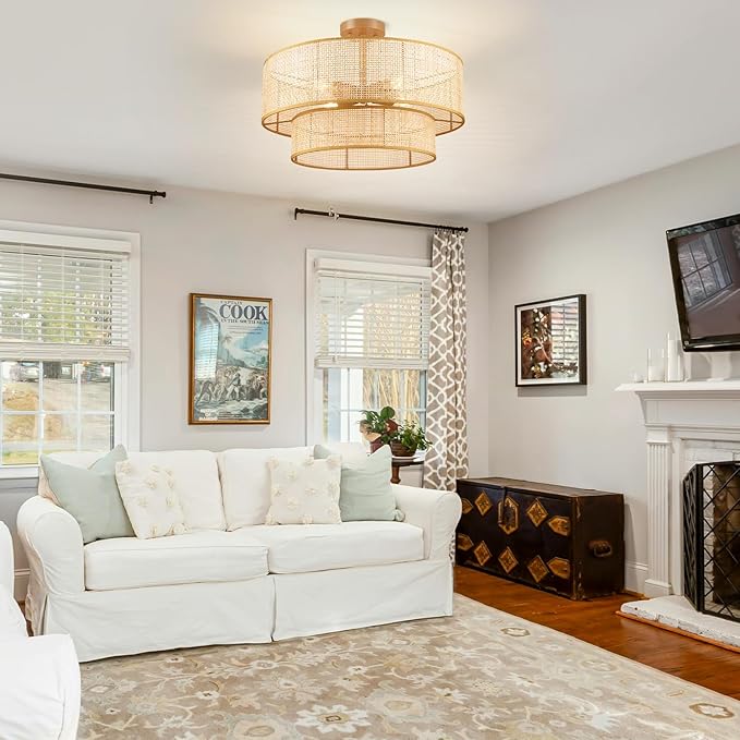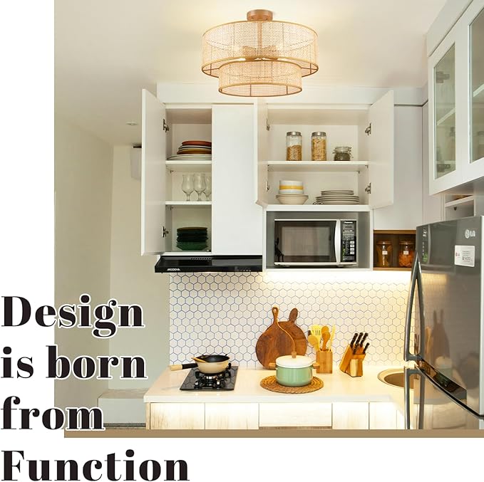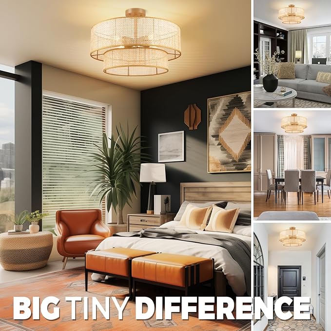 - 🦁 Handcrafted woven ceiling lights for bedroom with wicker shade: The intricately handwoven rattan lamp shade made from high-quality bamboo and rattan, the eco-friendly materials provides a warm, diffused glow, creating a cozy and inviting atmosphere while adding a unique aesthetic to your home décor.