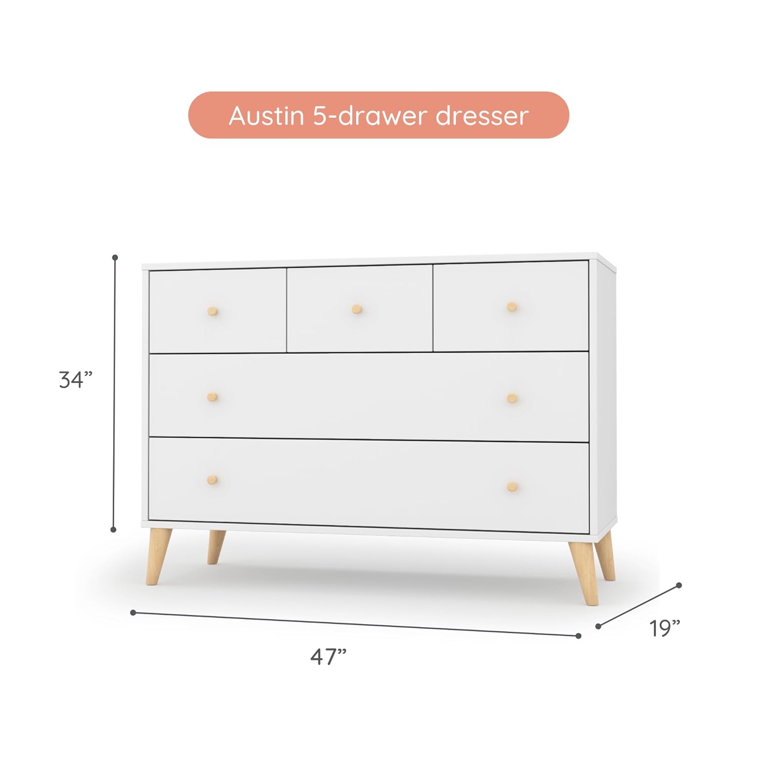 - Show-Stopping 5-Drawer Austin Dresser: Whether paired with the Austin 3-in-1 Convertible Crib or standing alone, this dresser adds undeniable style and storage to any nursery. With sleek rubberwood legs and a sophisticated design, it’s built to be a standout piece that grows with your child.