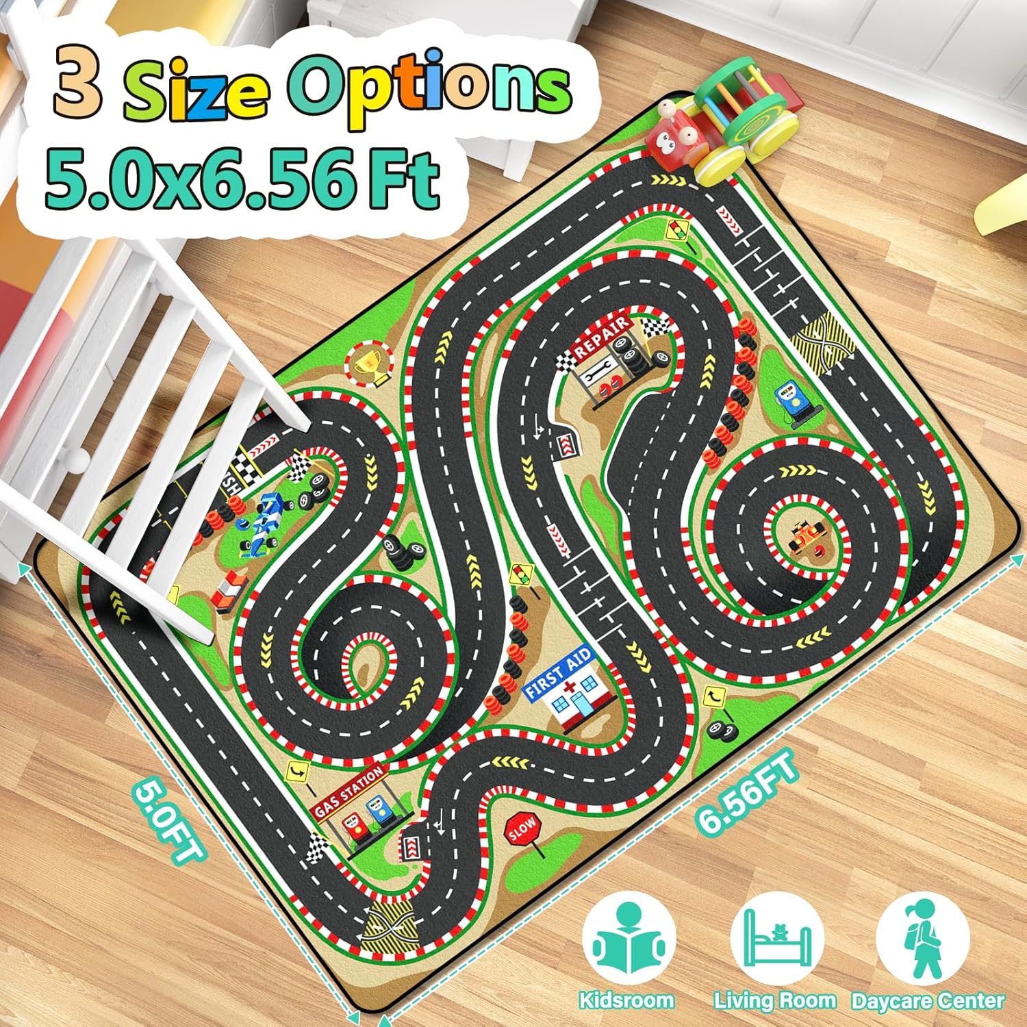 Kids Rug, Race Track Baby Play Mats, Realistic 3D Cascading Surround Route,5x7 Ft Kids Rug for Playroom, Great for Playing with Cars and Toys, Non-Slip Car Carpet