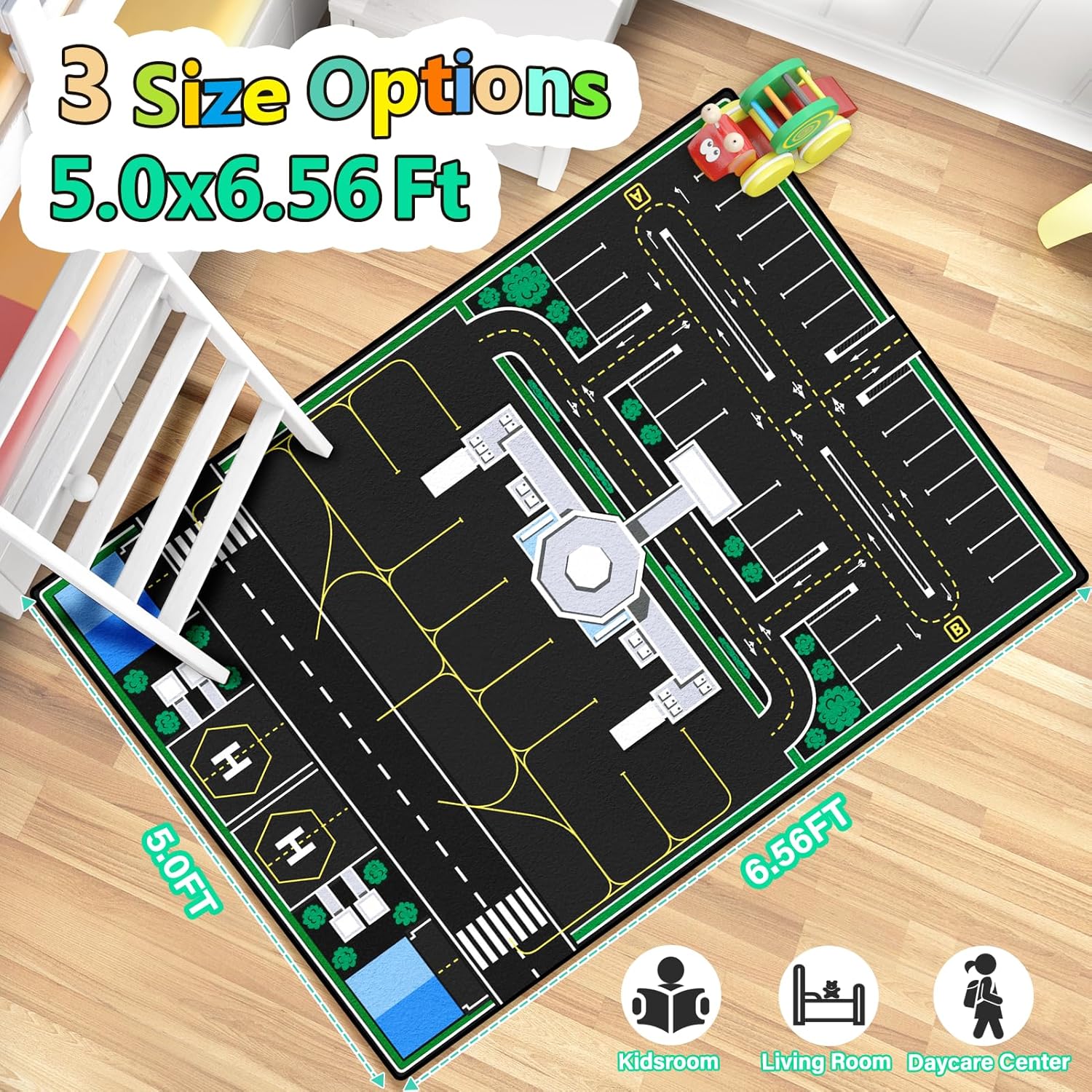 - [Machine Washable Kids Play Rug]This car rug for kids toy cars measures 5 x 7 feet/60*79 inches.0.4'' thick.Our mat is easy to clean by vacuum or machine.Perfect bedroom rug, living room rug, and playroom rug