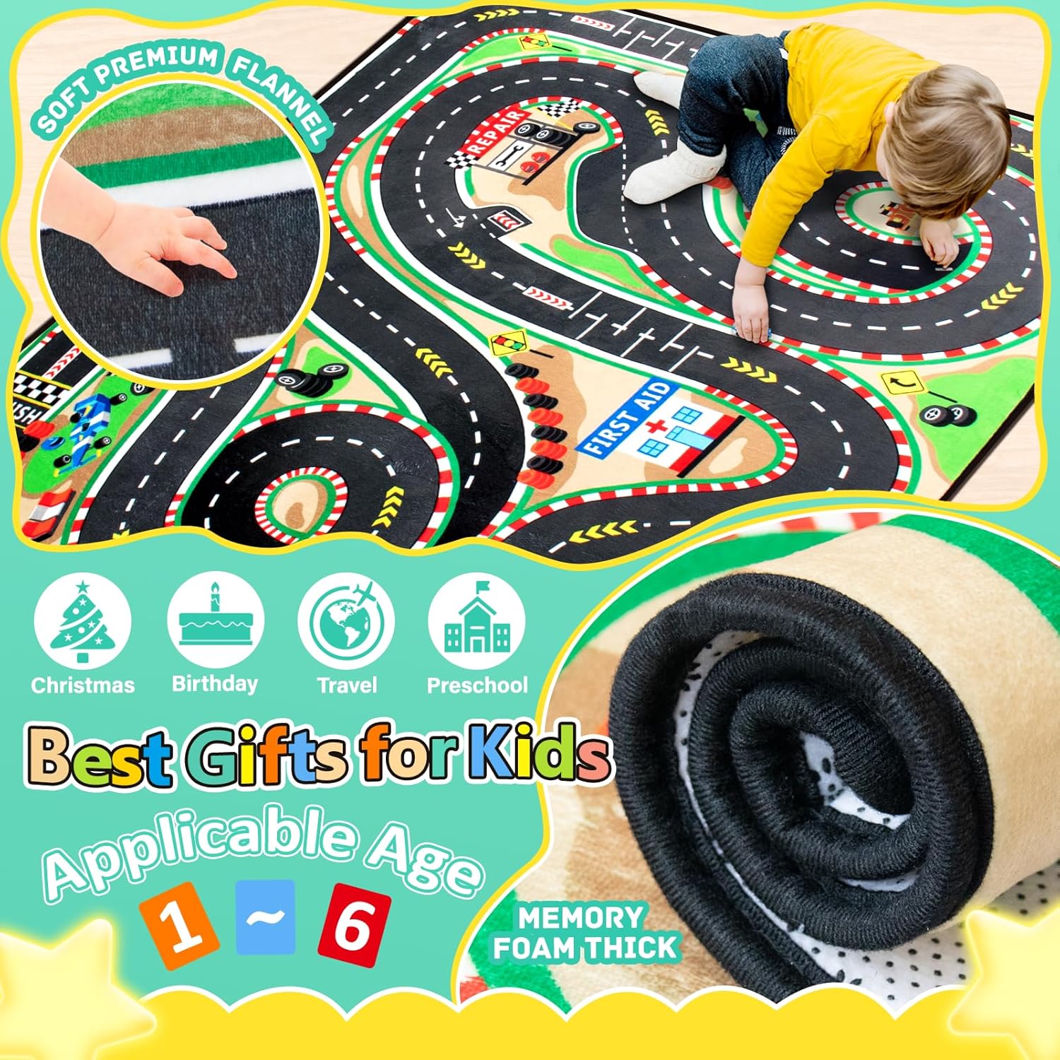 - [Unique Design]: This race track rug features a realistic 3D cascading surround route, complete with a start, and Finish line markings. The car rug is perfect for kids who enjoy playing with race cars. The vibrant colors enhance indoor play, creating an exciting outdoor experience at home.