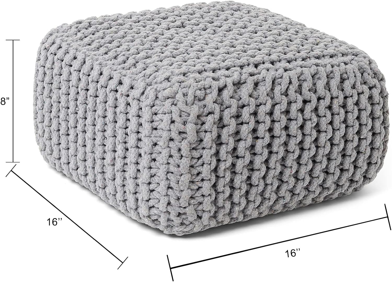 - HANDMADE FROM THE FINEST MATERIALS: The outer material on this eye-catching pouf ottoman is made from 100% cotton chord knitted in a unique pattern and filled with thermocol block inserts. Each floor pouf measures 16x16x8 inches and is handmade by our talented in-house artisans. This floor pouf is perfect when you need to rest your leg