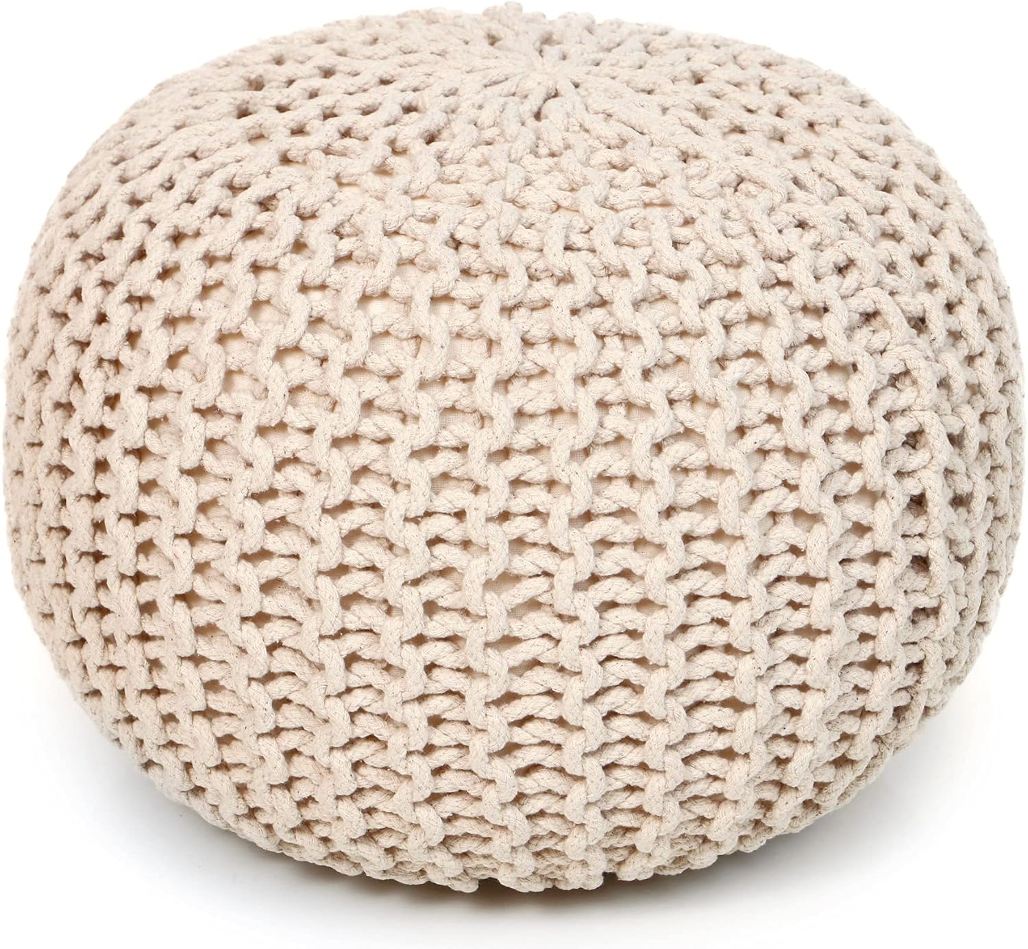 REDEARTH Round Pouf Ottoman –18"x18"x14" Hand-Knitted Cotton Pouffe –Cable Footstool –Boho Dori Hassock –Pre-Stuffed Poof – Extra Seat -Poofy Footrest for Living Room, Bedroom, Nursery, Nook –Ivory