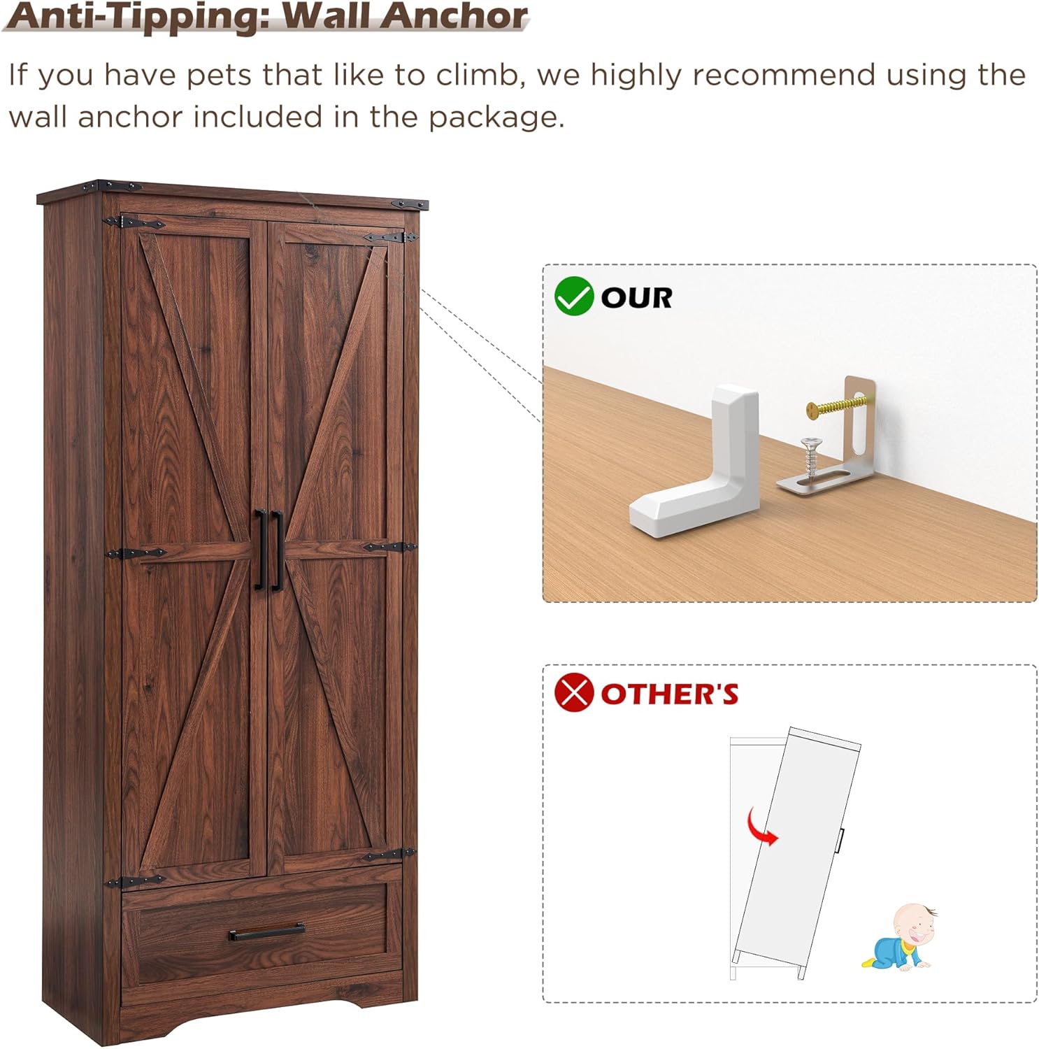 - Sturdy and Safe Design: Crafted from high-quality engineered wood and metal, this cabinet is built for stability and longevity. It includes an anti-tip safety kit for secure wall mounting, ensuring stability even in households with pets. Enjoy peace of mind knowing your family’s safety is a priority