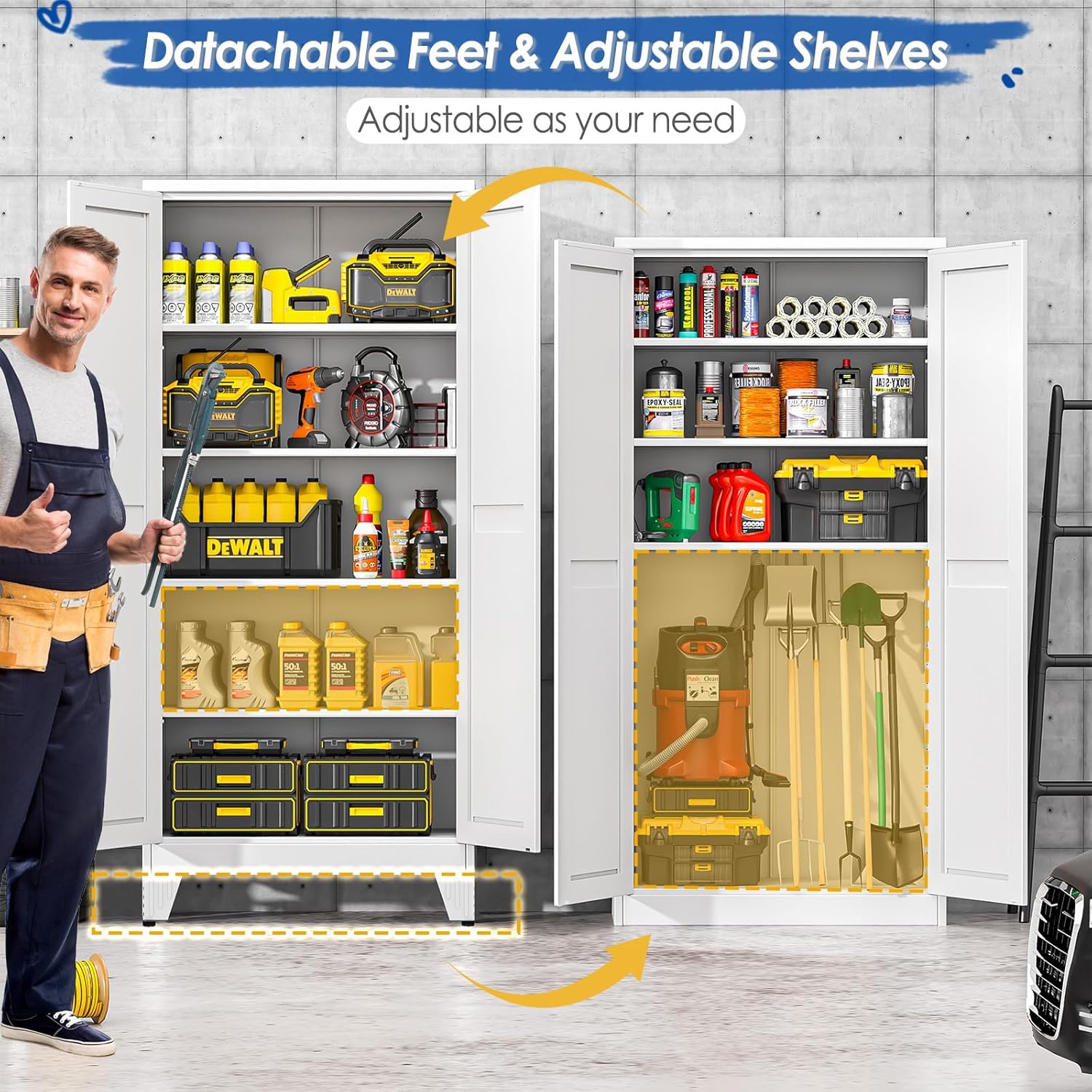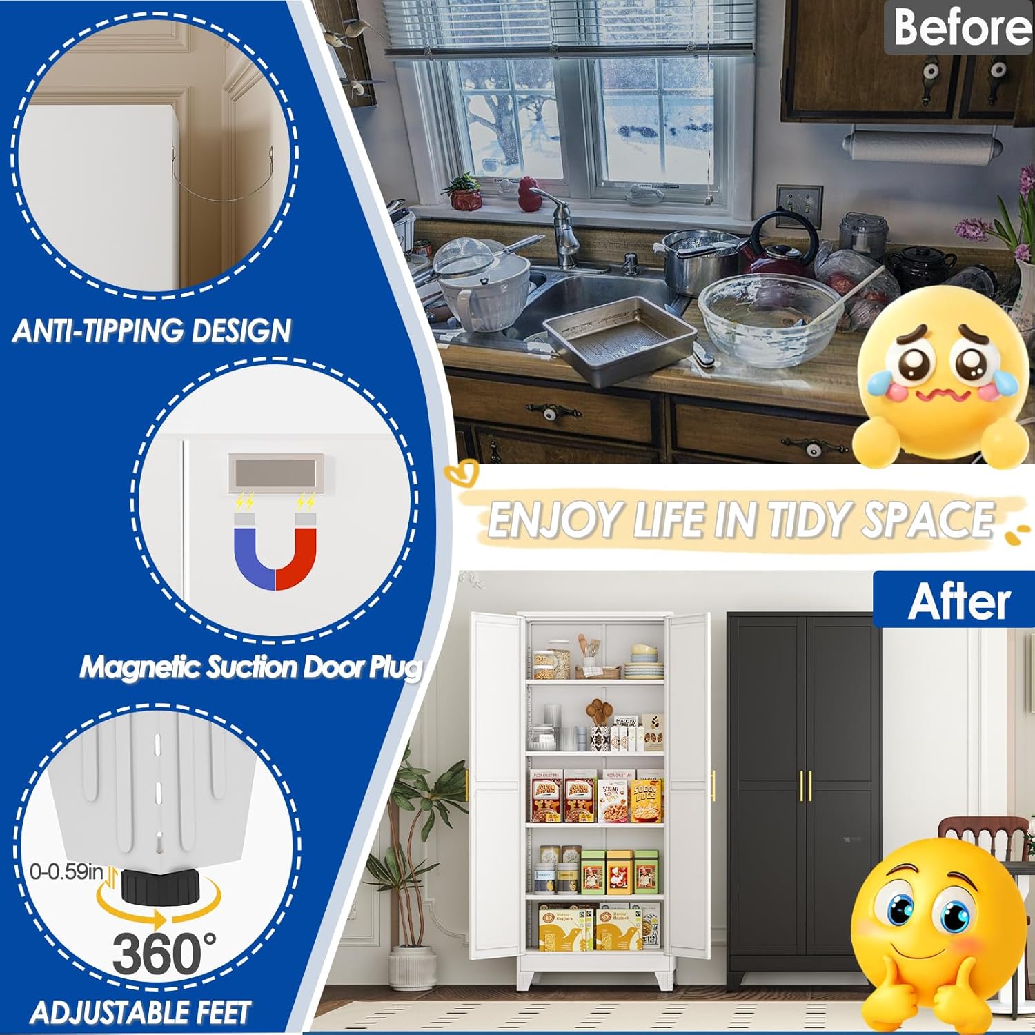 71" Tall Metal Storage Cabinet with 2 Doors and 4 Adjustable Shelves, Kitchen Pantry Cabinet White Freestanding Cupboard, 5 Tier Multifunctional Steel Storage for Office, Kitchen, Dining Room