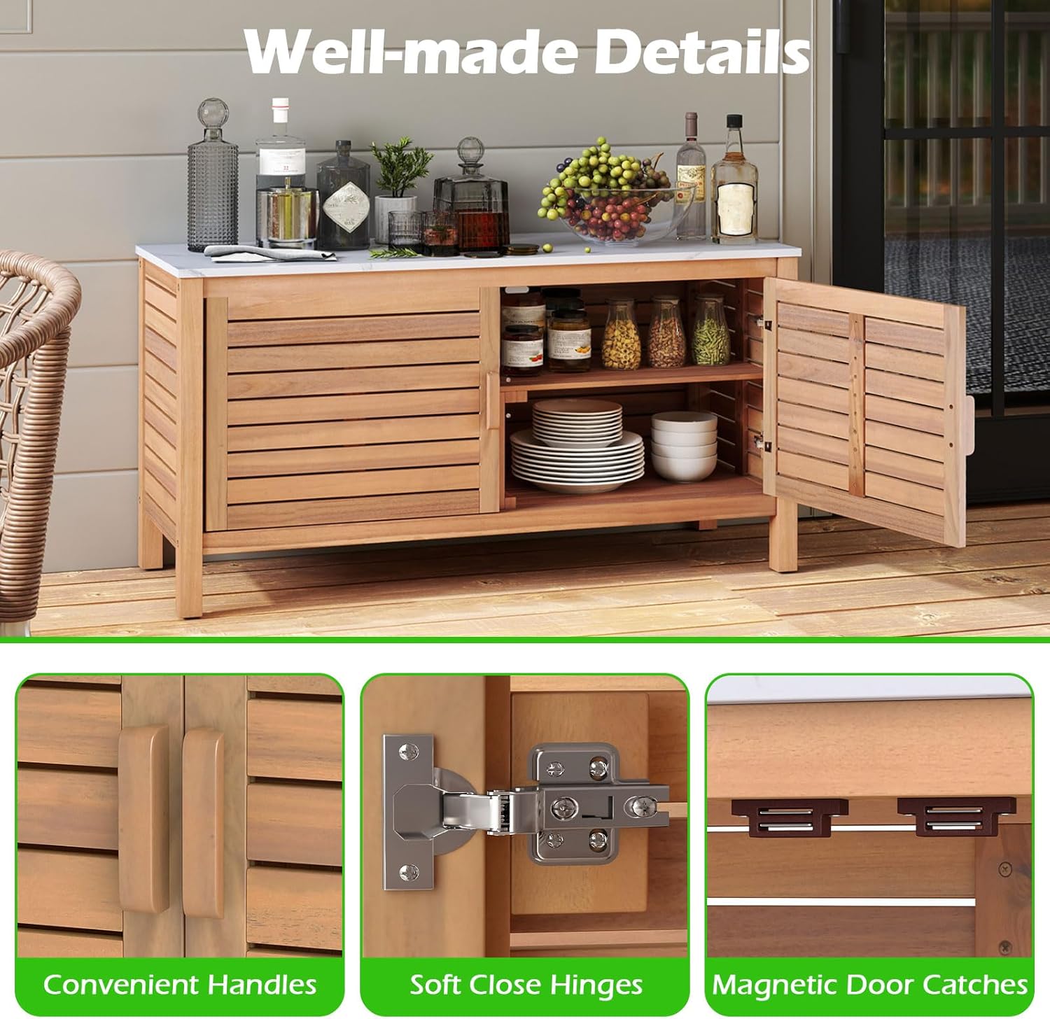 Goplus Patio Storage Cabinet, 2-Door Acacia Wood Storage Container with Faux Marble Top, Outdoor Wooden Sideboard for Deck, Garden, Lawn and Backyard