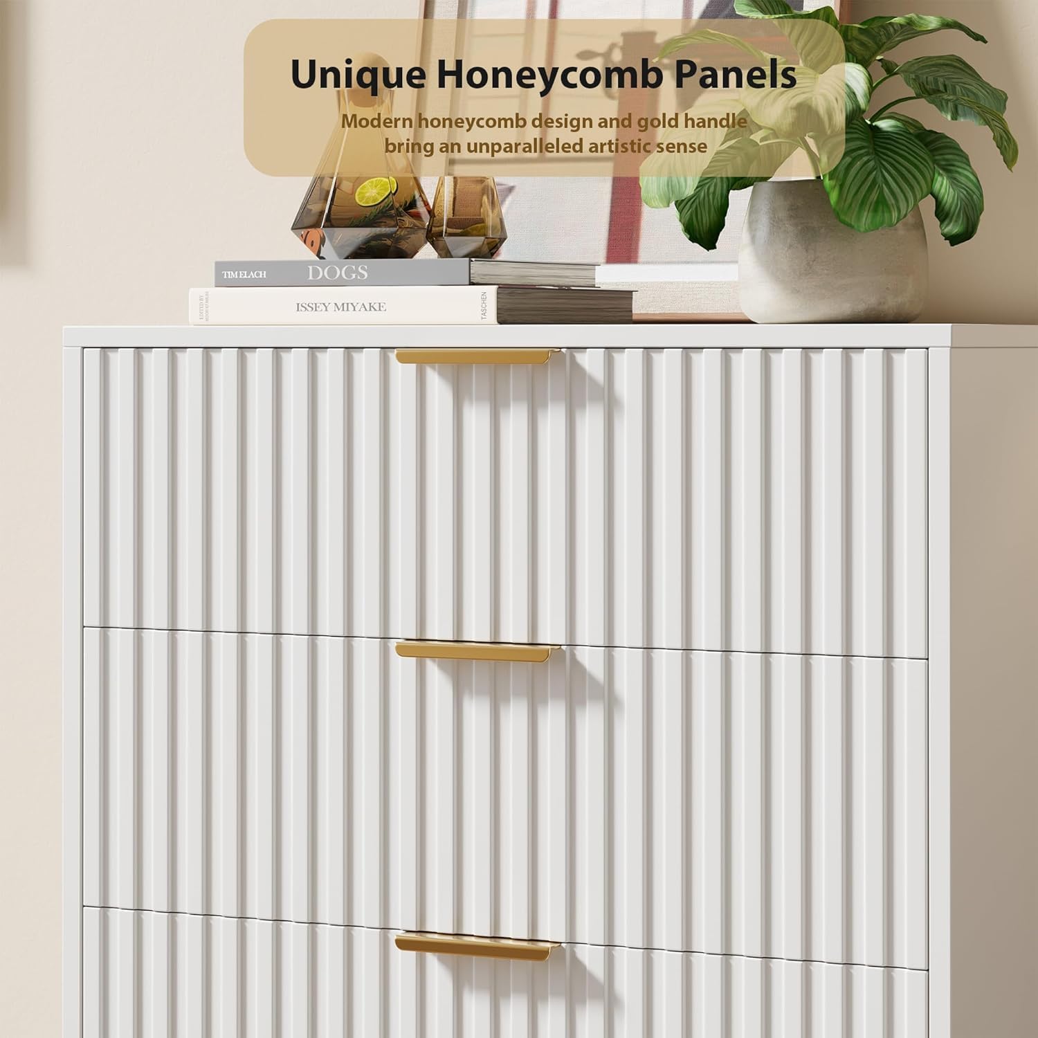- Luxurious & Elegant Design: 5 drawer dresser for bedroom is a true masterpiece in design, functionality, and luxury. Tall 5 drawer dresser with fluted design panels and gold leg support design offers the perfect combination of style and convenience. White 5 drawer dresser will look great used as a chest of drawers.