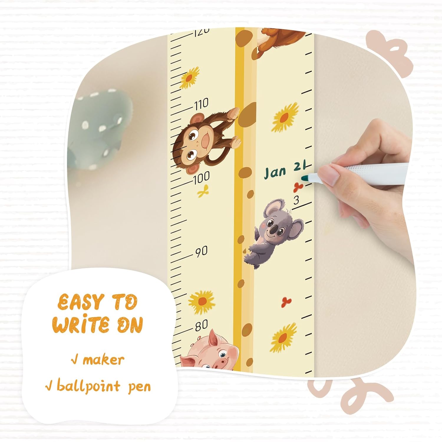 - Design: Kids growth chart with rope at the top of the chart, easy to install and removeable, foldable and portable design, easy to store, hang, roll up, transport, and save space. It boasts a material that's easy to write on, where you can use dark colored ballpoint pens and markers to track growth milestones.